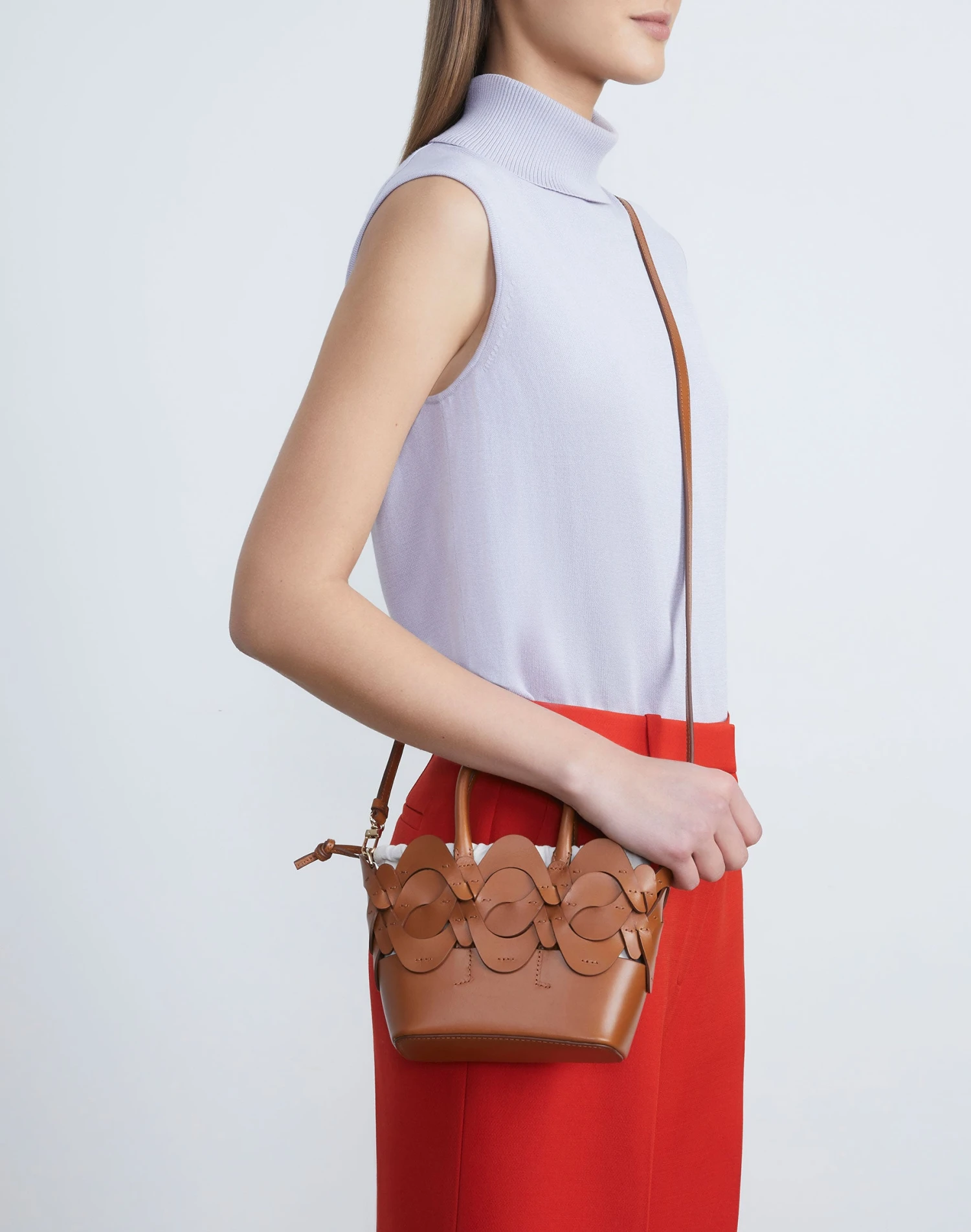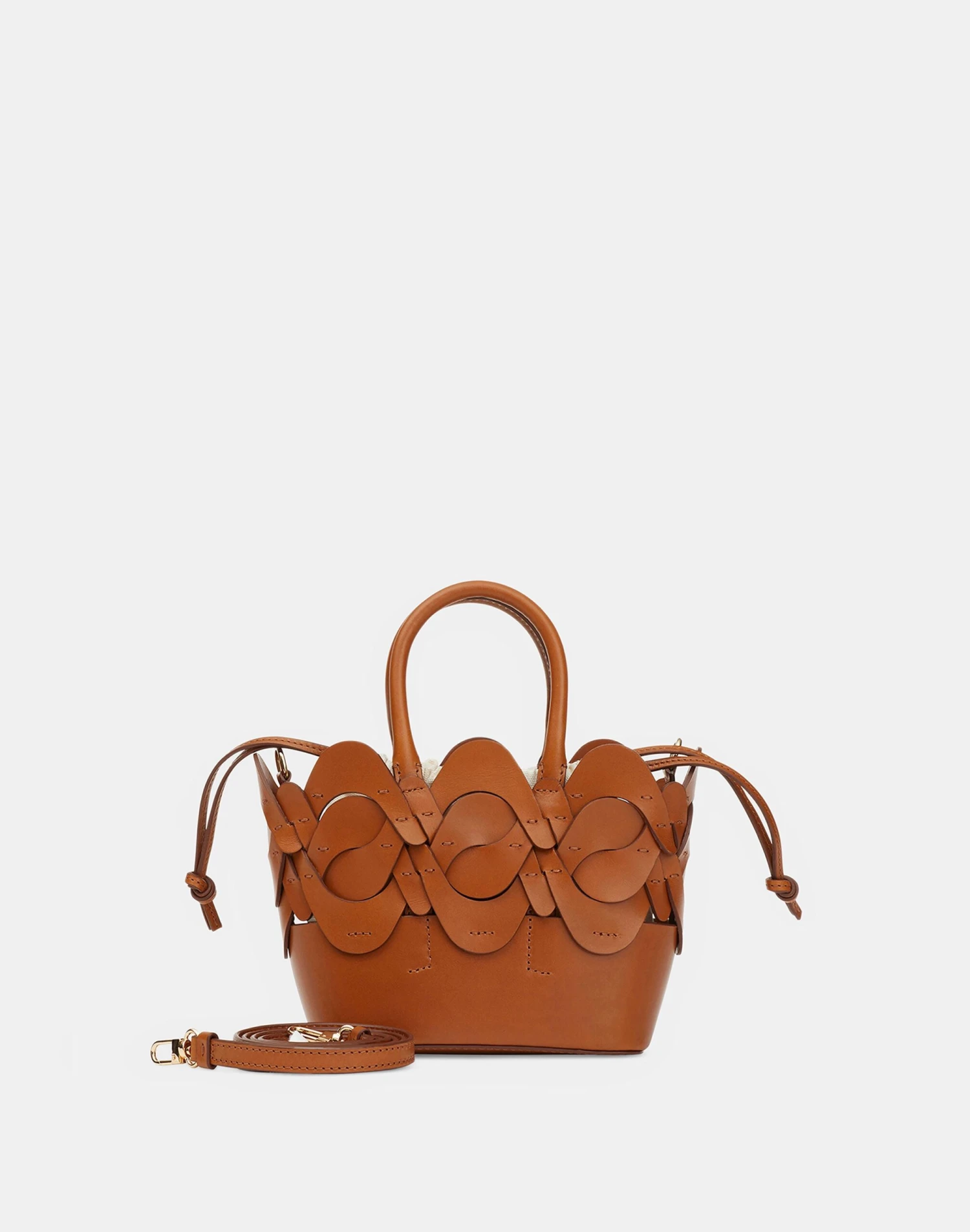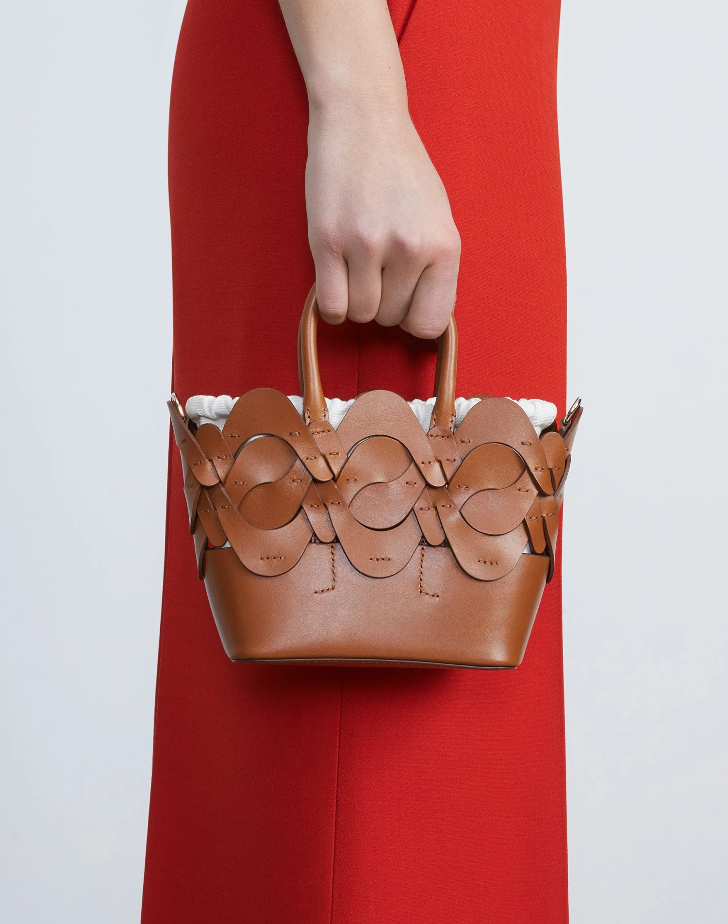 Luxurious Italian craftsmanship meets sculptural design in this top-handle mini tote, crafted in naturally tanned Italian vachetta leather that’s handwoven into L148’s signature 8 Knot icon. The interior is perfectly sized to tote essentials and features a removable linen drawstring bag for added versatility.