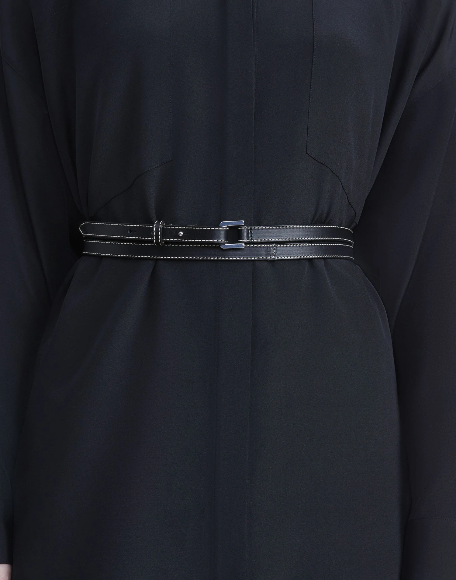 Crafted in Italy from smooth, naturally-tanned vachetta leather, this thin belt features a double wrap construction and a utilitarian-inspired D-ring tab closure. Polished metal hardware and intricate topstitching lend artisanal finishing touches.