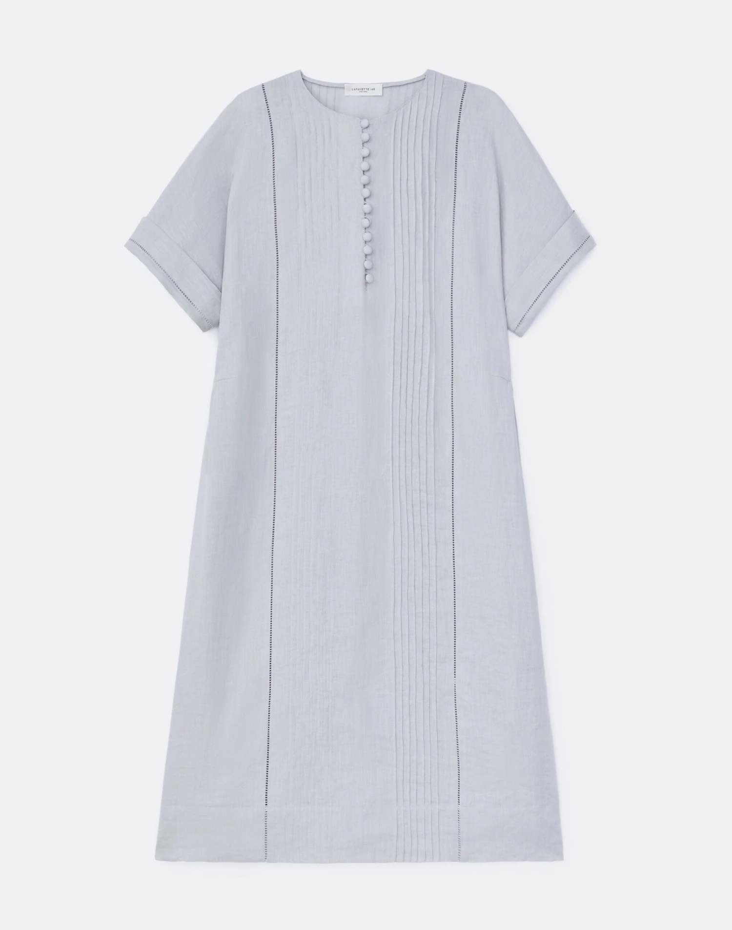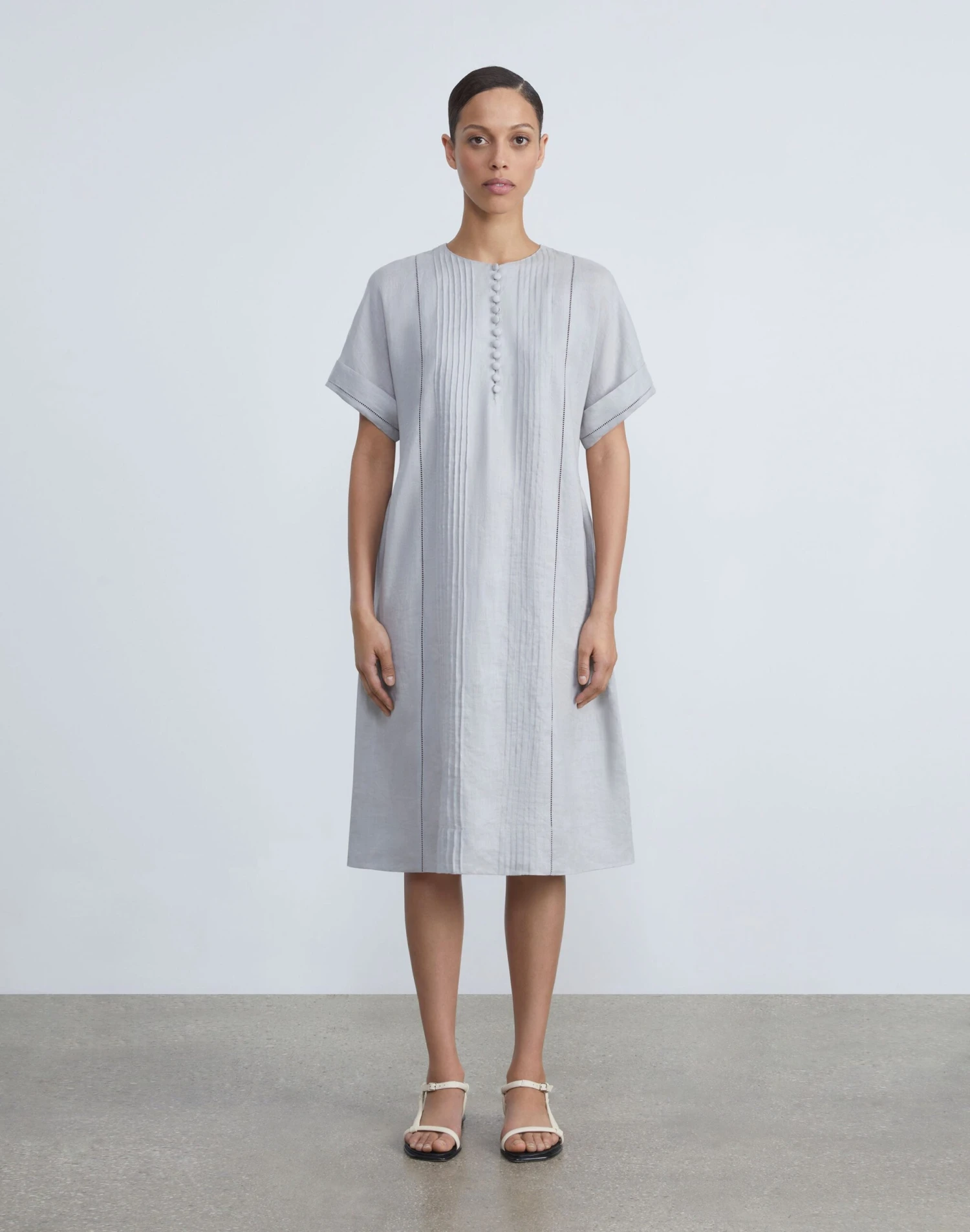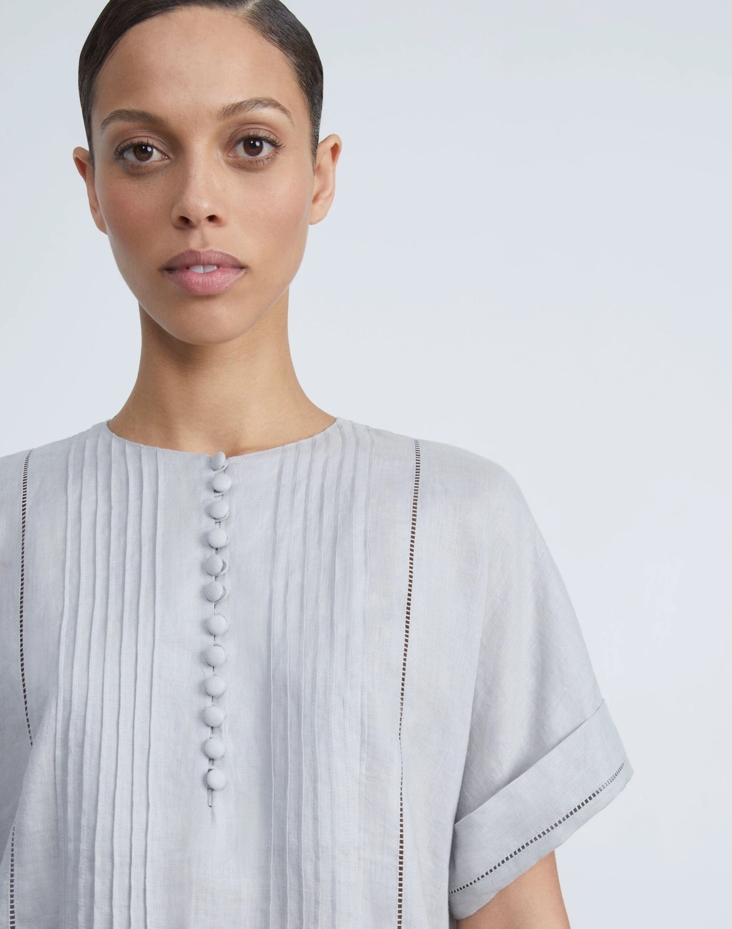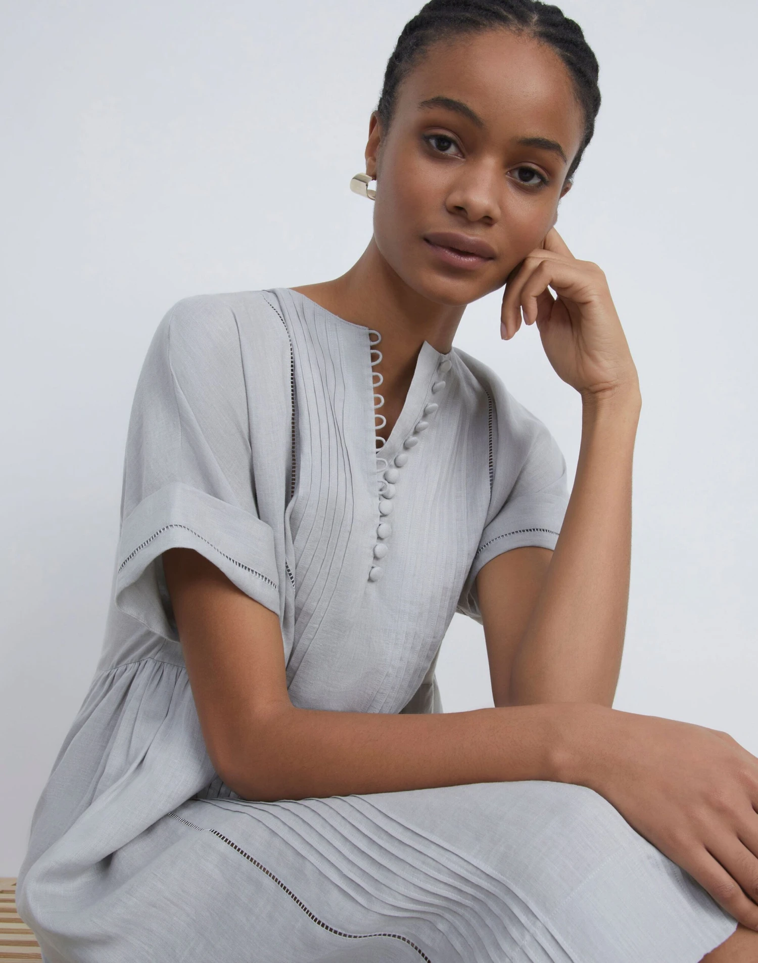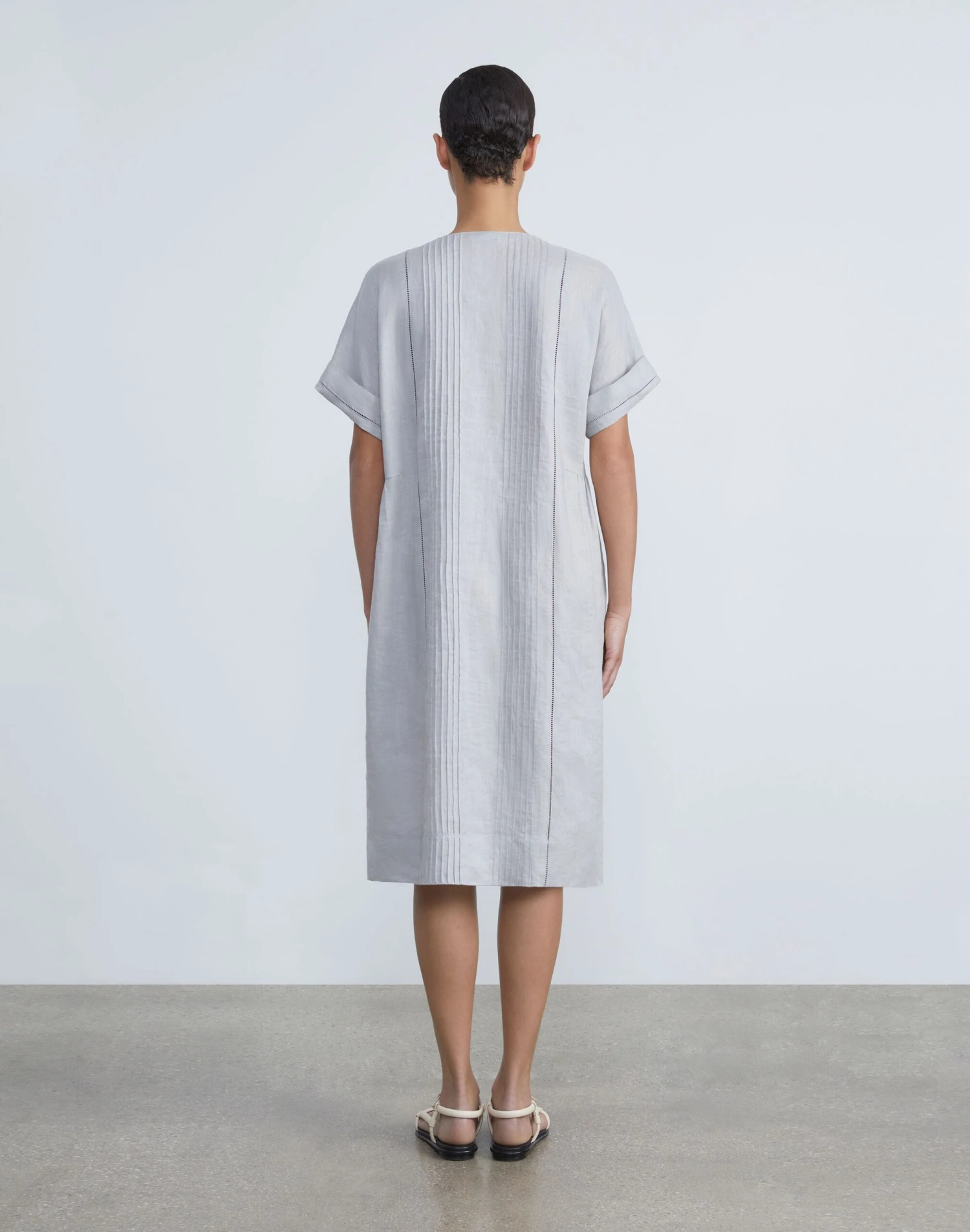 Crafted for ease in lightweight linen with a soft, vintage finish, this popover dress is meticulously detailed with rows of linear pintucks and intricate ladder stitching. The relaxed silhouette is balanced by cuffed short sleeves and a knee-grazing hem, and fastens with dainty covered-buttons and rouleau loops—a signature Pre-Fall 2023 collection detail inspired by the scalloped edges of archival stamps.