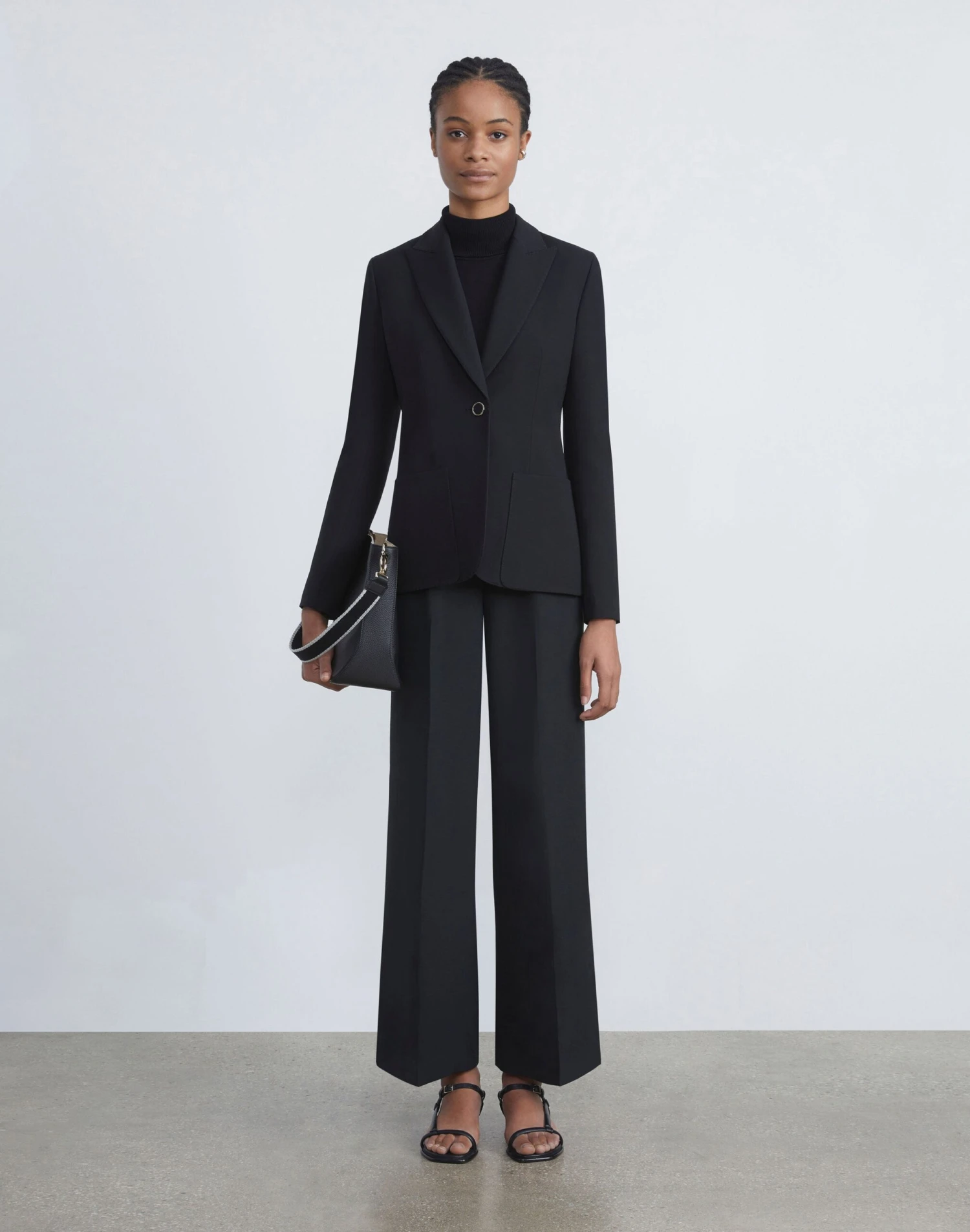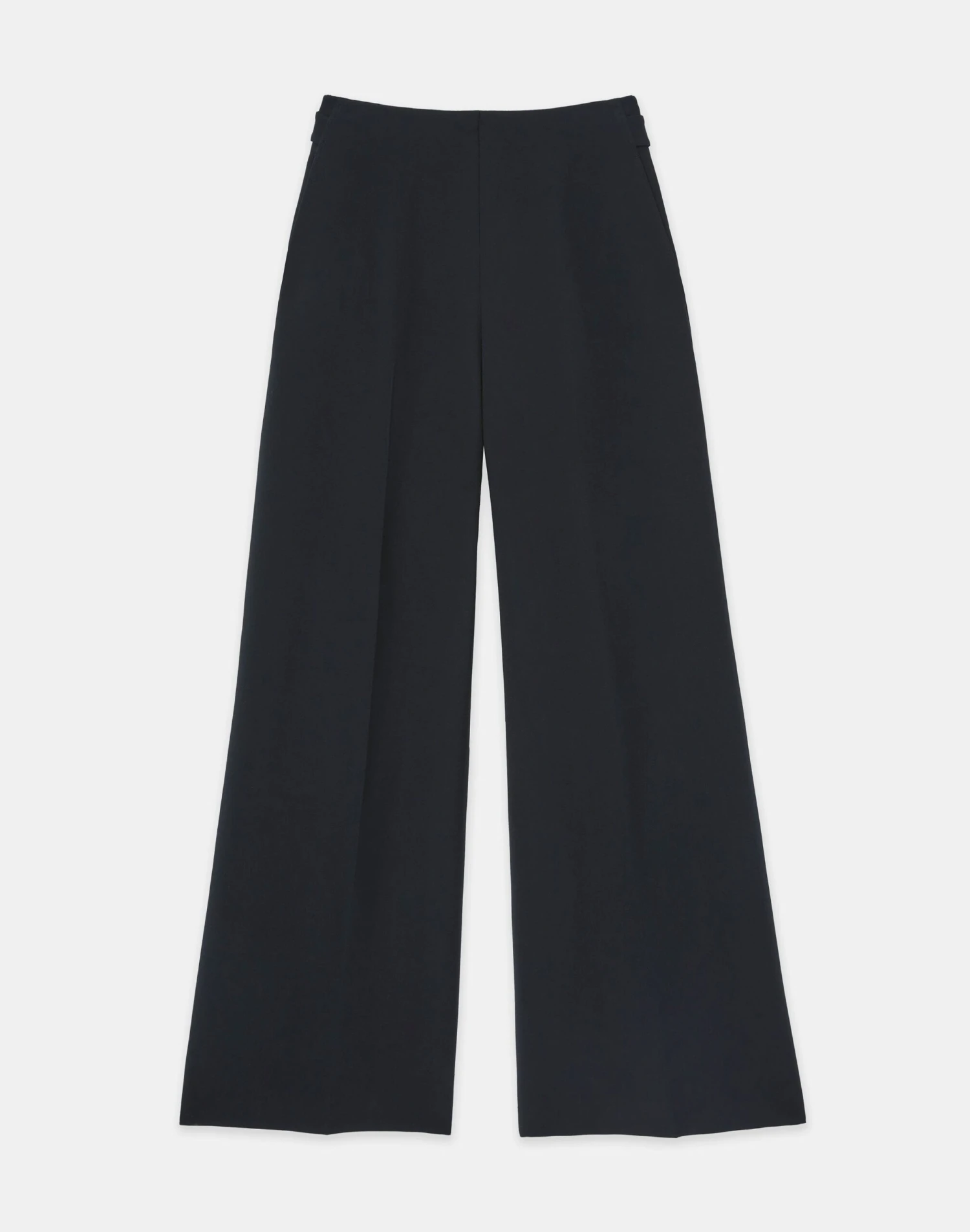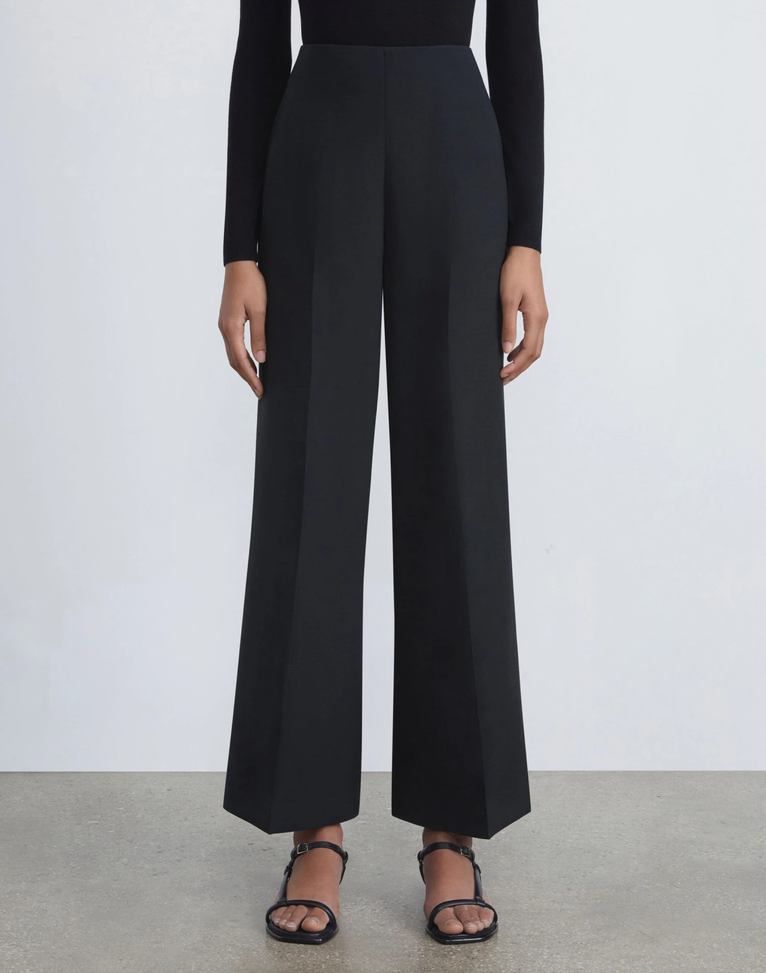 Precision cut with modern proportions, the Bowery pant features a fluid wide leg, clean ankle crop and waist-defining high rise accented by metal-framed button tabs. Expertly tailored from richly textured wool-silk crepe, this polished pair is finished with a hidden side zip and crisp pressed creases.