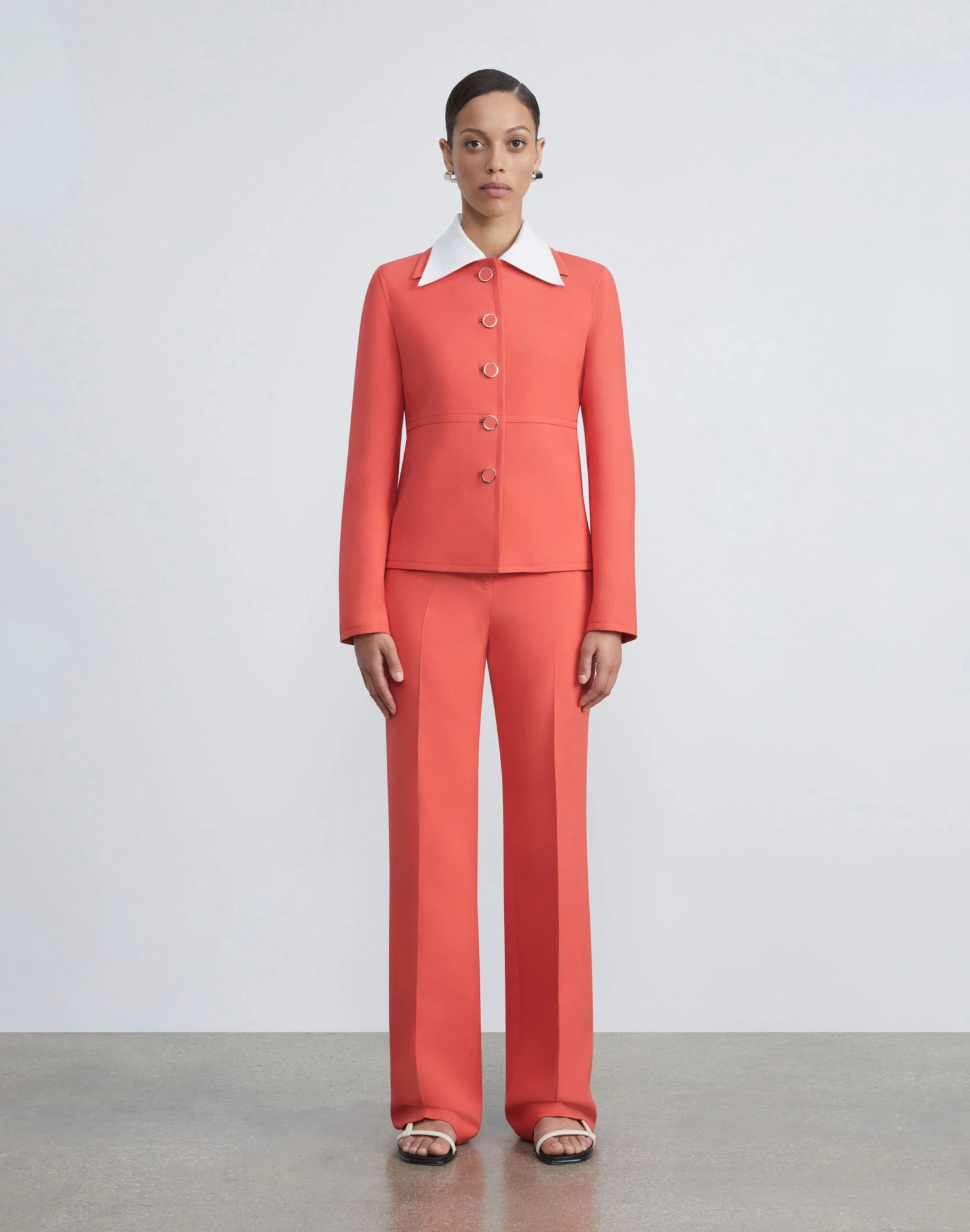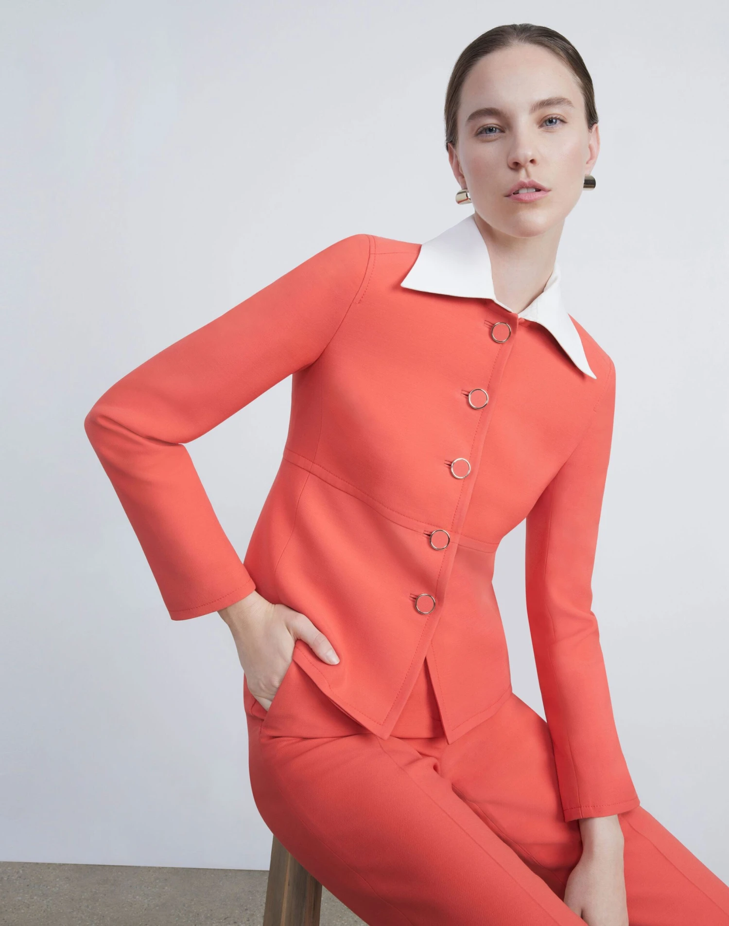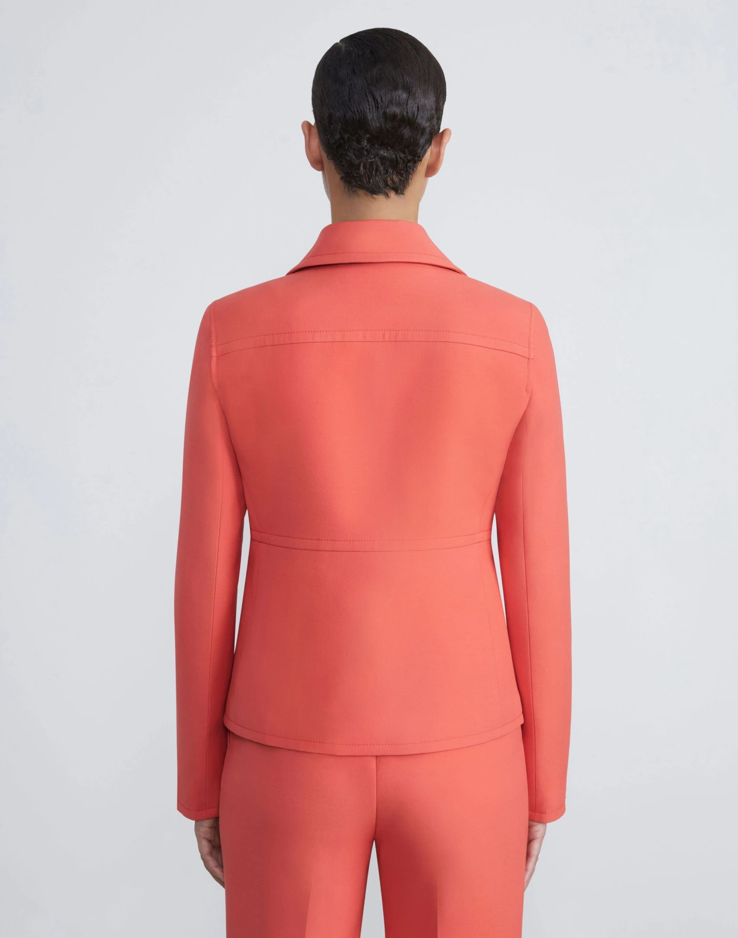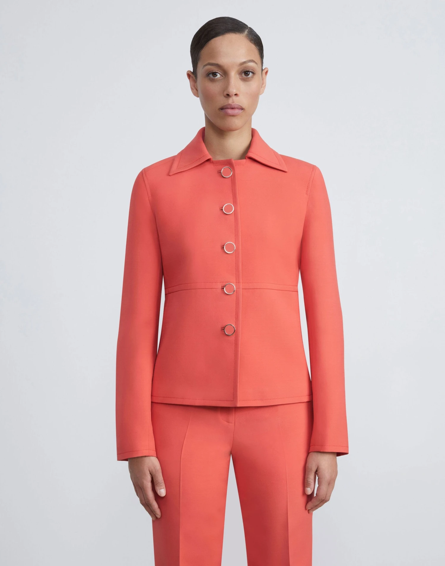 Precision cut and flawlessly finished, this fitted shirt jacket is expertly crafted from richly textured wool-silk crepe and fastens with metal-framed button closures—a nod to the collection’s ’70s-inspired aesthetic. The fitted shape is defined by the House’s signature tailoring with lightly structured shoulders, sculpting gore panels and refined topstitching.